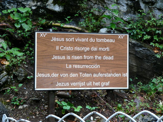 後ろの穴が墓所の象徴であろう。つまり死者が甦り、墓から出て来た事を表しているようだ。前の前の掲示板では、6カ国語で「イエスは死から蘇った」と書いてある。